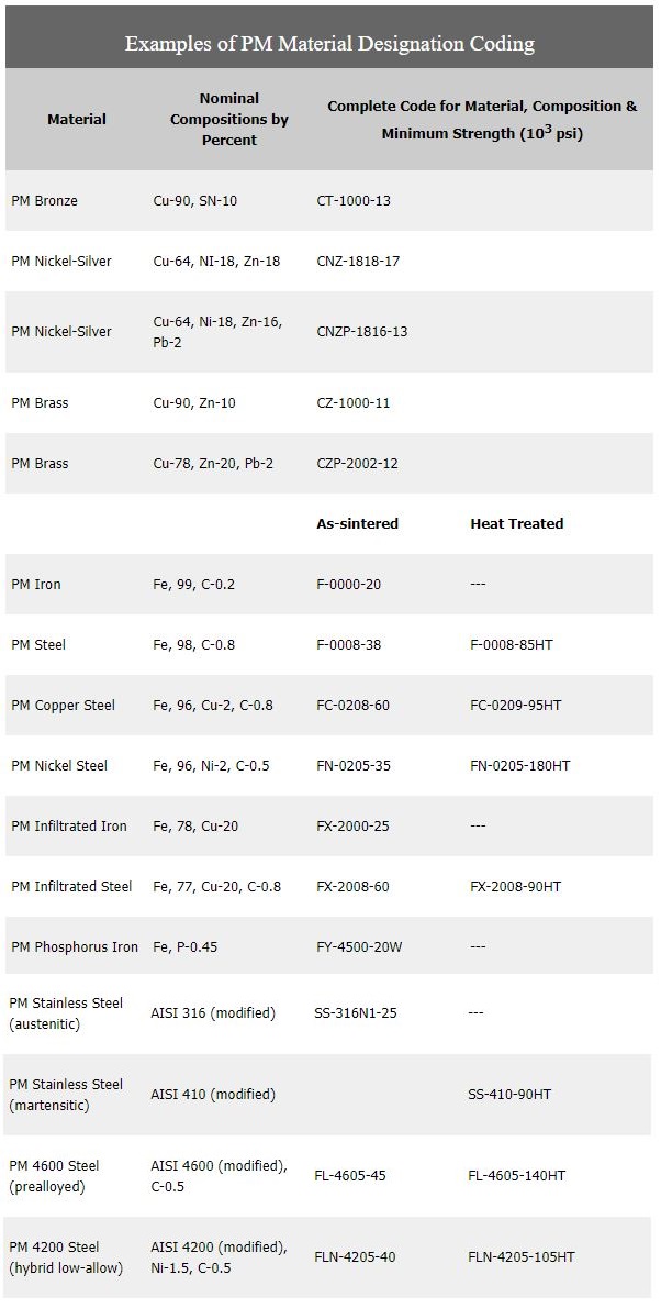 A coding system offers a convenient means for designating both the chemical composition and minimum strength value of any standard PM material. It is based on the system established by the industry with the addition of a two-or three-digit suffix representing minimum strength in place of a suffix letter indicating density range. The density is given for each standard material as one of the typical values.