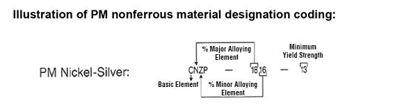 The PM material code designation or identifying code in the case of structural PM parts defines a specific material as to chemical composition and minimum strength expressed in 103 psi. For example, FC-0208-60 is a PM copper steel material containing nominally 2% copper and 0.8% combined carbon possessing a minimum yield strength of 60 X 103 psi (60,000 psi) (410 MPa) in the as-sintered condition.