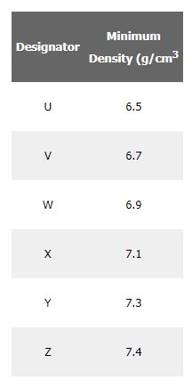 For example, a pure iron material at a minimum density of 6.9 g/cm3 and coercive field strength of 2.3 Oe would be designated as F-0000-23W. The iron-0.45% phosphorus alloy at a 7.1 g/cm3 minimum density and coercive field strength of 2.0 Oe would be designated as FY-4500-20X.